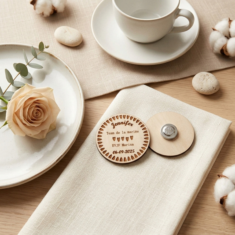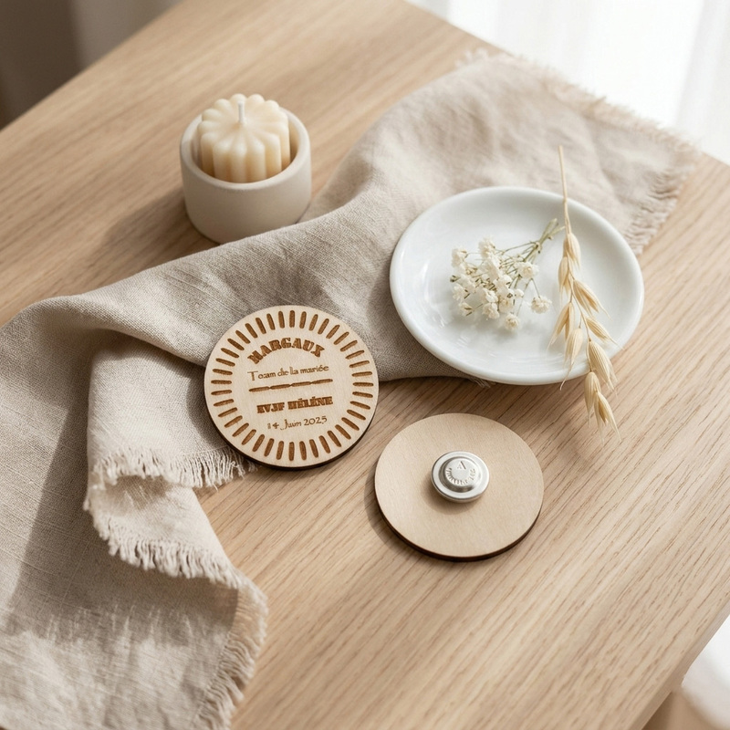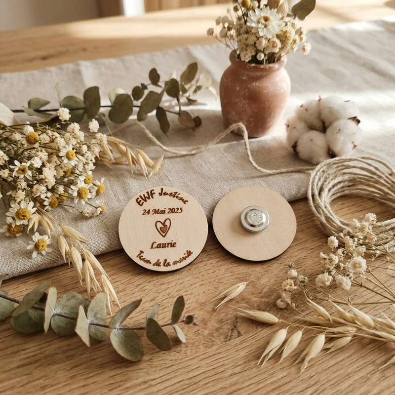 Gravé sur du bois naturel, ce badge apportera une touche bohème et raffinée à la tenue de chaque participante.