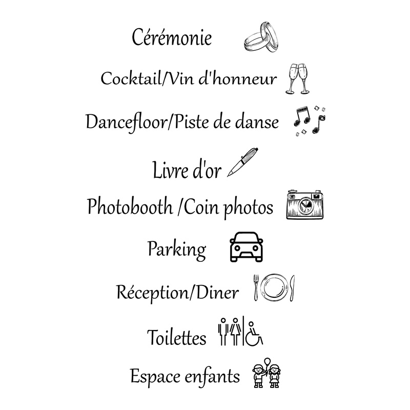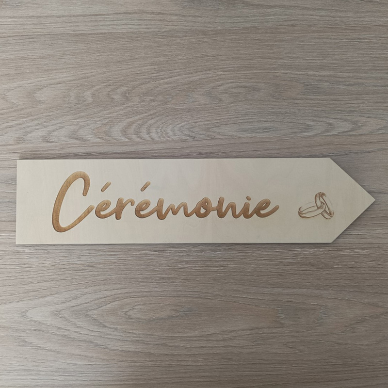 Chaque panneau est fabriqué à la main avec soin, dans un bois naturel de qualité. Vous pouvez personnaliser les inscriptions (ex : Cérémonie, Cocktail, Dîner, Parking, Photobooth…) ainsi que le style d’écriture.